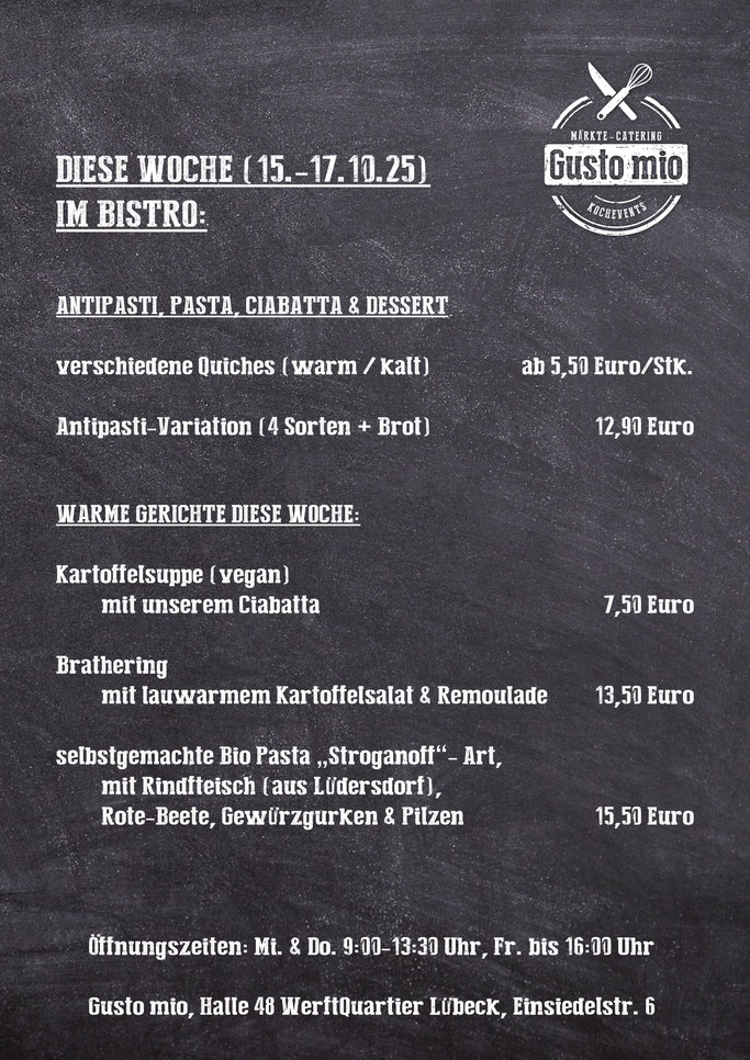 Unsere Spezialitäten gibt es in unserem Bistro oder auf den Wochenmärkten in Lübeck, Bad Schwartau und Neustadt. Mit Gusto mio wird deine Feier „einfach mal lecker“.
